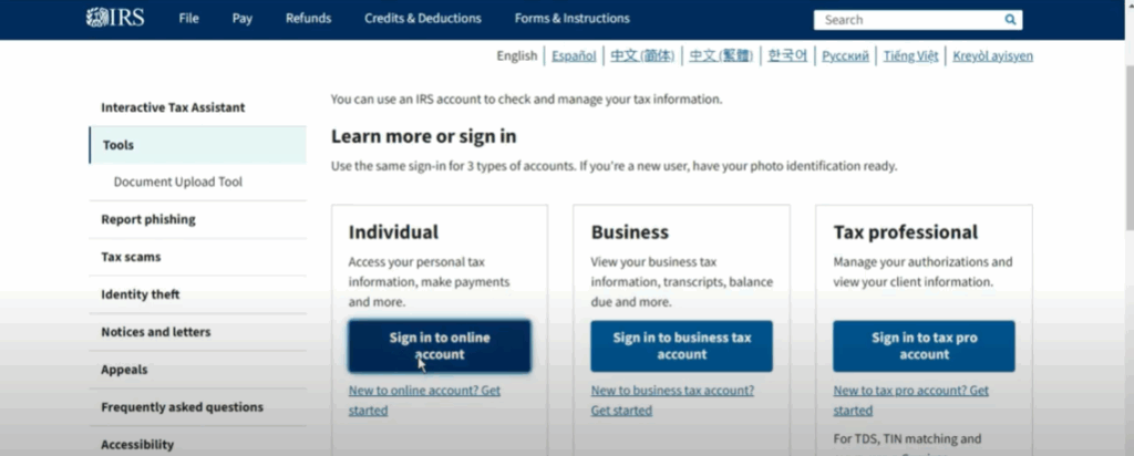 Start by visiting the official IRS website. Click on the “Sign into Your Account” option. Here, you’ll see sign-in options for individuals, businesses, and tax professionals. In this example, we’ll proceed with the individuals option.