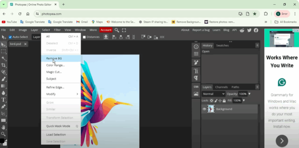 Open the photo whose background you want to remove. Like I have opened a photo of a bird here. Now go to the Select option and click on BG Remove. You will see that you will see the image with white background, which means the background of the photo has been removed.