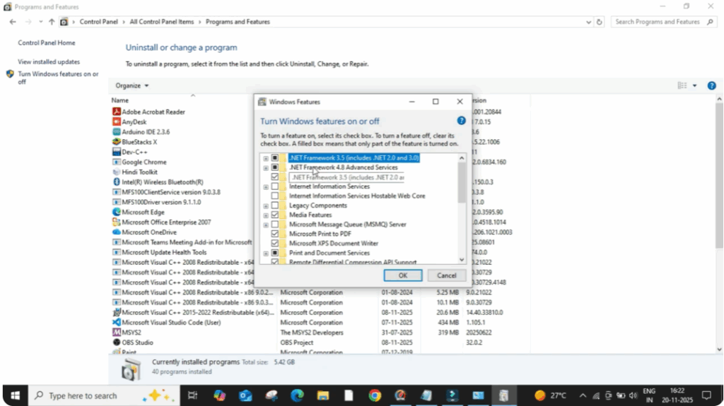 A new window will open and here make sure both options .NET Framework 3.5 and .NET Framework 4.8 are ticked.