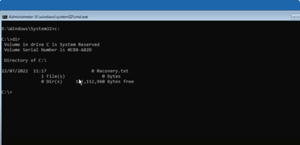 Here we are in the command prompt. First, we need to switch to the drive where Windows is installed. Usually, it’s the C drive, but let’s confirm. Type C and press enter. Then type dir and check the files. If you don’t see Windows related folders, it means Windows is not installed on this drive.
