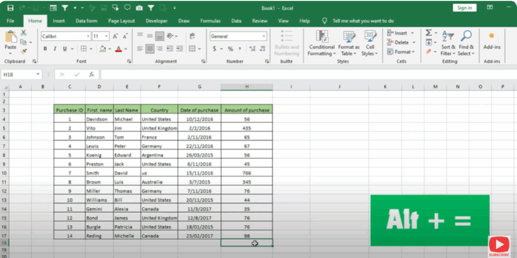 Suppose we want to add all these cells — we will press Alt + =, then press Enter, and all the cells will be added automatically.